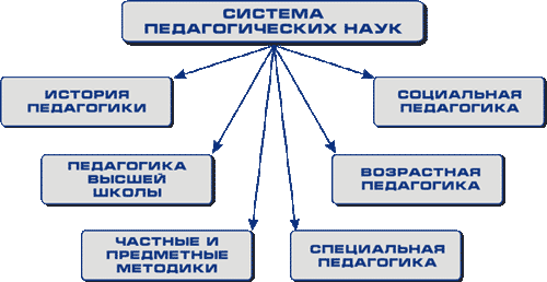 Система педагогических наук включает в себя большие разделы педагогики, указанные в схеме, от истории педагогики до специальной педагогики. Общая педагогика относится ко всем этим разделам и содержит общие основы педагогики: теорию обучения, теорию воспитания, школоведение. В специальную педагогику входит сурдопедагогика, тифлопедагогика, олигофренопедагогика.