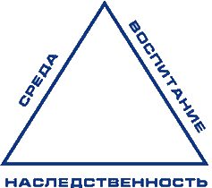 Естественнонаучные представления основываются на том, что человек - это живой организм, который рождается, живёт, стареет и умирает. Развитие - это свойство живой материи. Философы представляют развитие как борьбу противоречий: внутреннего (наследственного) и внешнего (среды). Одна из наиболее уравновешенных моделей развития - идея равностороннего треугольника Шванцара (рис.2), согласно которой три компонента развития: среда, воспитание и наследственность вносят одинаково весомый вклад в результат образования человека.